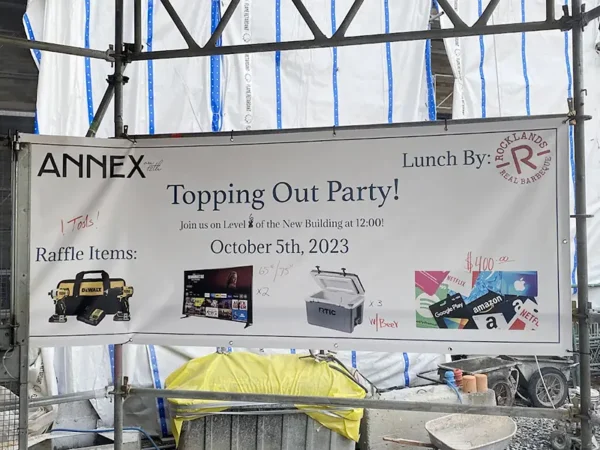 A Topping Off (also called Topping Out) party is the equivalent to smacking a bottle of champagne off a new boat. Except there’s food and lots of hard hats.